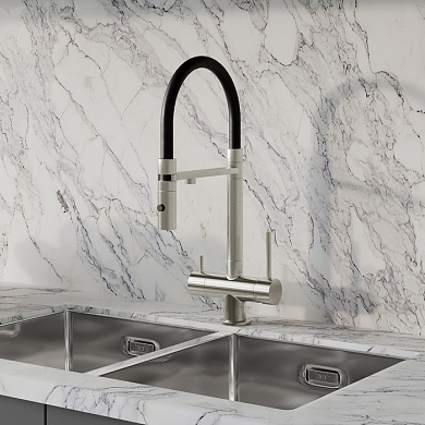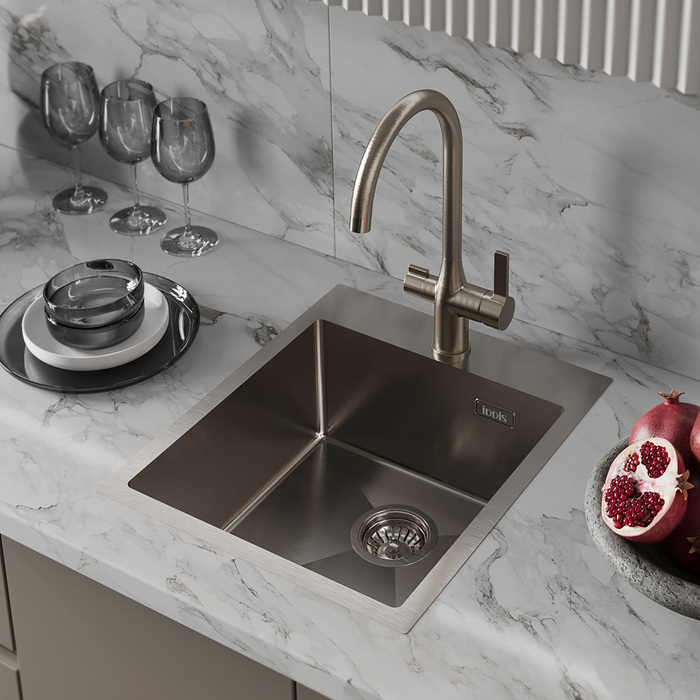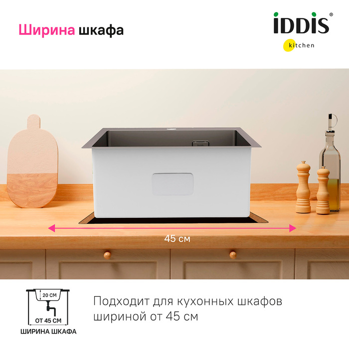 Мойка Haze отличается современным дизайном и ручным методом производства, что позволяет добиться идеальной геометрии – малый радиус скругления углов увеличивает рабочее пространство без «слепых» зон. Удобно разместить много посуды и мыть крупные предметы. Подходит для шкафа от 45 см. Глубина 20 см.