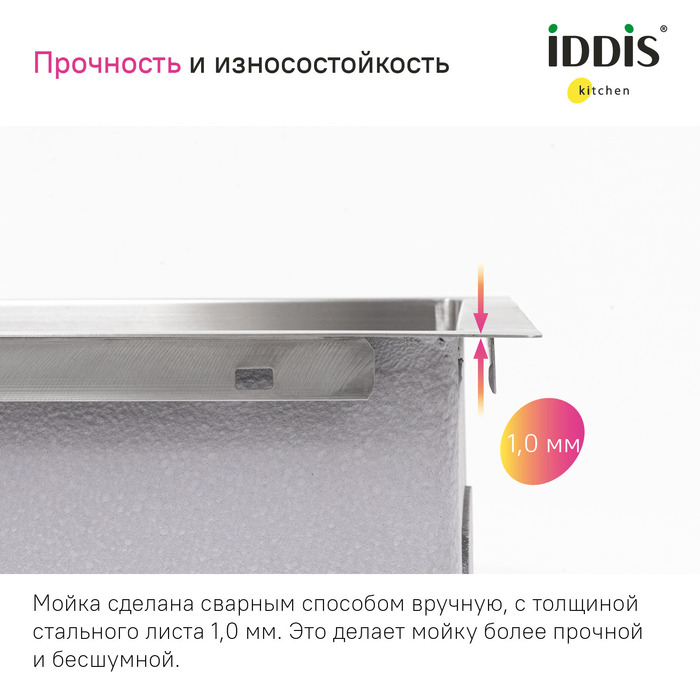 • Мойка толщиной 1 мм выполнена из качественной нержавеющей стали AISI 304; сталь содержит 18% хрома и 8% никеля, что надежно защищает ее от коррозии. Стойкая к износу, выдерживает различные t, легко моется, долго служит. При правильном уходе надолго сохранит привлекательный внешний вид.