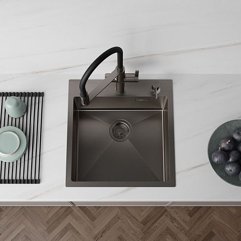 • Красивый и стойкий графитовый цвет достигается путем обработки мойки парообразным металлом: частички краски проникают в структуру стали и образуют микрослой (PVD-покрытие) на поверхности.