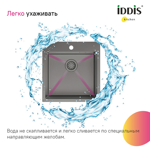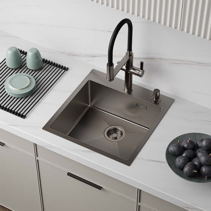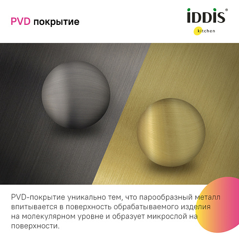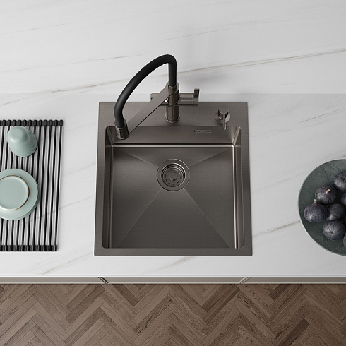 • Красивый и стойкий графитовый цвет достигается путем обработки мойки парообразным металлом: частички краски проникают в структуру стали и образуют микрослой (PVD-покрытие) на поверхности.