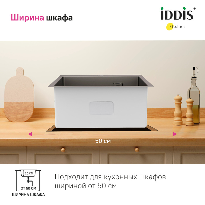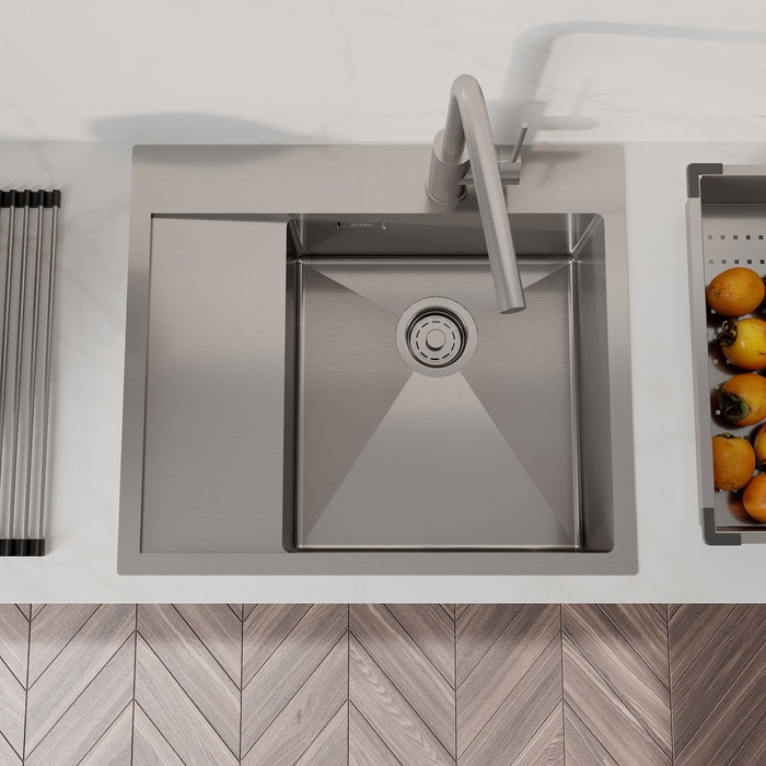 Мойка Haze отличается современным дизайном и ручным методом производства, что позволяет добиться идеальной геометрии – малый радиус скругления углов увеличивает рабочее пространство без «слепых» зон. Удобно разместить много посуды и мыть крупные предметы. Подходит для шкафа от 50 см. Глубина 20 см.