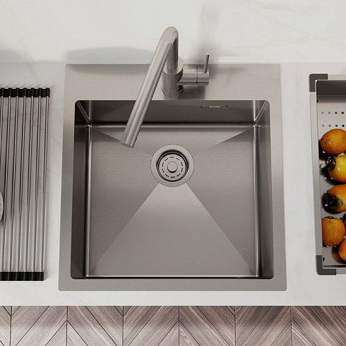 Мойка Haze отличается современным дизайном и ручным методом производства, что позволяет добиться идеальной геометрии – малый радиус скругления углов увеличивает рабочее пространство без «слепых» зон. Удобно разместить много посуды и мыть крупные предметы. Подходит для шкафа от 50 см. Глубина 20 см.
