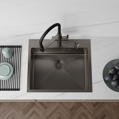 • Красивый и стойкий графитовый цвет достигается путем обработки мойки парообразным металлом: частички краски проникают в структуру стали и образуют микрослой (PVD-покрытие) на поверхности.