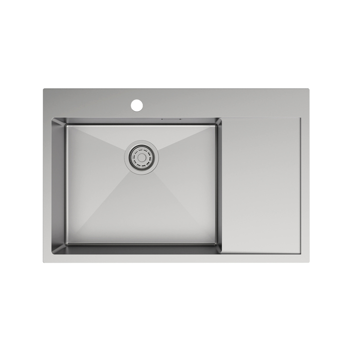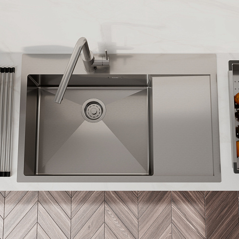 Мойка Haze отличается современным дизайном и ручным методом производства, что позволяет добиться идеальной геометрии – малый радиус скругления углов увеличивает рабочее пространство без «слепых» зон. Удобно разместить много посуды и мыть крупные предметы. Подходит для шкафа от 80 см. Глубина 20 см.