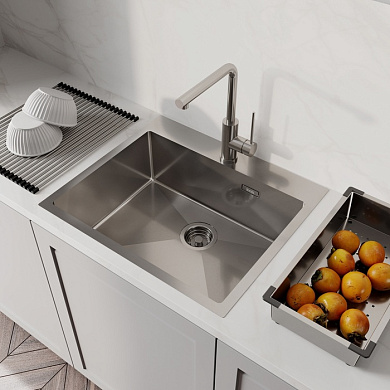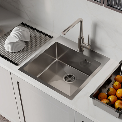 Мойка Haze отличается современным дизайном и ручным методом производства, что позволяет добиться идеальной геометрии – малый радиус скругления углов увеличивает рабочее пространство без «слепых» зон. Удобно разместить много посуды и мыть крупные предметы. Подходит для шкафа от 80 см. Глубина 20 см.