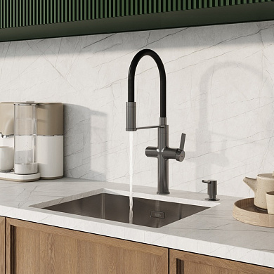 • Красивый и стойкий графитовый цвет достигается путем обработки мойки парообразным металлом: частички краски проникают в структуру стали и образуют микрослой (PVD-покрытие) на поверхности.