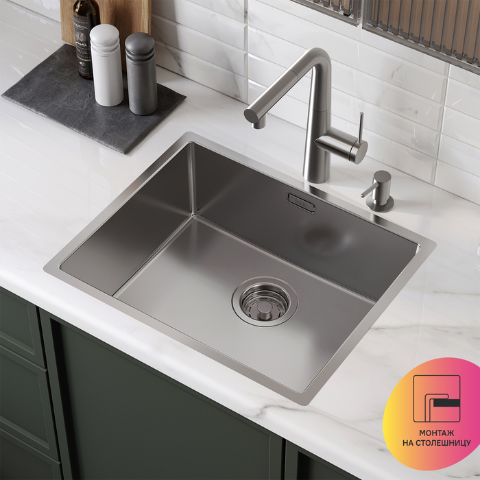 • Универсальный монтаж на ваш выбор: установка сверху на столешницу (вырез под мойку составляет 516х416хR20 мм), подстольным (вырез под мойку составляет 505х405хR12,5 мм) и интегрированным вровень со столешницей способом.