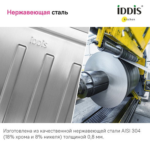 • Мойка из качественной нержавеющей стали AISI 304 толщиной 0,8 мм; сталь содержит 18% хрома и 8% никеля, что надежно защищает ее от коррозии. Стойкая к износу, выдерживает различные t, легко моется, долго служит. При правильном уходе надолго сохранит привлекательный внешний вид.