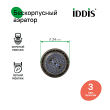 Встраиваемый аэратор IDDIS® представляет собой сетчатую насадку на смеситель, предназначенную для насыщения воды кислородом без заметного снижения напора струи. Рисунок нижней сетки типа «соты» обеспечивает высокую шумоизоляцию и лучшее распределение потока, не позволяя брызгам воды заливать пространство вокруг. Аэратор IDDIS® дает возможность улучшить качество воды за счет фильтрации крупных нежелательных частиц и примесей, сделать ее менее хлорированной. Модель подходит для комплектации смесителей для умывальника IDDIS® с внутренней резьбой крана диаметром 24 мм. Изделие устанавливается непосредственно в корпус смесителя без дополнительных монтажных гаек, что обеспечивает красивый и минималистичный внешний вид смесителя.