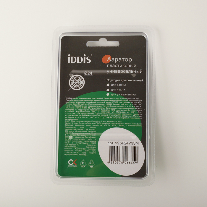 Встраиваемый аэратор IDDIS® представляет собой сетчатую насадку на смеситель, предназначенную для насыщения воды кислородом без заметного снижения напора струи. Рисунок нижней сетки типа «соты» обеспечивает высокую шумоизоляцию и лучшее распределение потока, не позволяя брызгам воды заливать пространство вокруг. Аэратор IDDIS® дает возможность улучшить качество воды за счет фильтрации крупных нежелательных частиц и примесей, сделать ее менее хлорированной. Модель подходит для комплектации смесителей IDDIS® с внутренней резьбой крана диаметром 24 мм. Изделие устанавливается непосредственно в корпус смесителя без дополнительных монтажных гаек, что обеспечивает красивый и минималистичный внешний вид смесителя.
