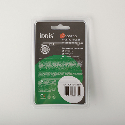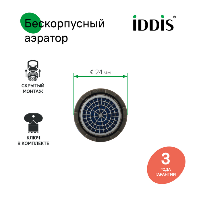 Встраиваемый аэратор IDDIS® представляет собой сетчатую насадку на смеситель, предназначенную для насыщения воды кислородом без заметного снижения напора струи. Работая с минимальным уровнем шума аэратор IDDIS® обеспечивает надёжное функционирование смесителя: он дает возможность улучшить качество воды за счет фильтрации нежелательных примесей. Модель подходит для комплектации смесителей IDDIS® с внешней резьбой крана диаметром 24 мм. Изделие устанавливается непосредственно в корпус смесителя без дополнительных монтажных гаек, что обеспечивает красивый и минималистичный внешний вид смесителя.