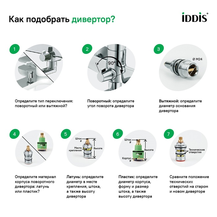 Поворотный дивертор IDDIS® позволяет сделать водные процедуры ощутимо комфортнее: надежно и плавно переключая поток воды даже при минимальном давлении в трубах. Дивертор подходит для комплектации новых или замены изношенных элементов смесителей.
