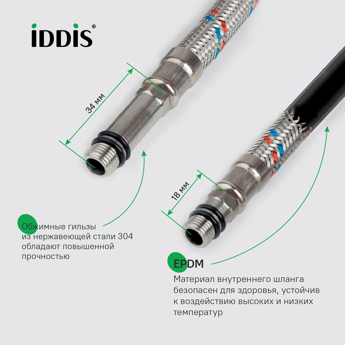 • Сочетание элементов позволяет гибкой подводке IDDIS выдерживать давление до 80 атм.