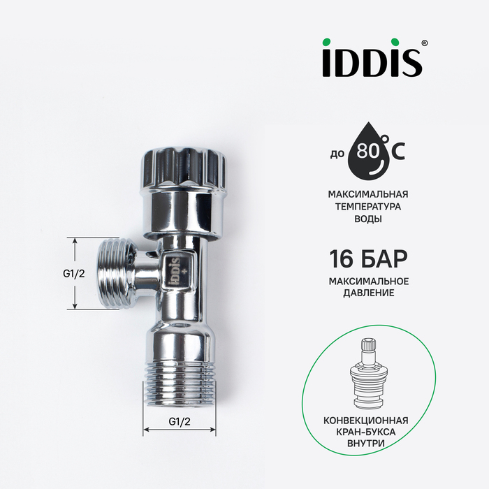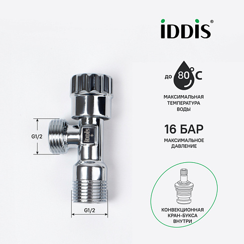Угловой кран для подключения сантехприборов сделан из надежной латуни и имеет кран-буксу внутри, которая не закисает и подвижна даже при редком использовании, обеспечивая плавность и легкость поворота ручки.