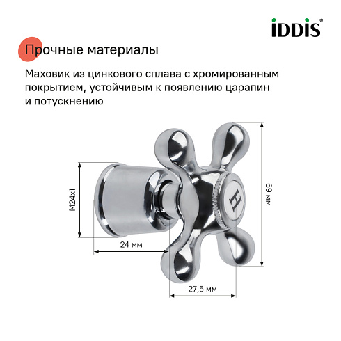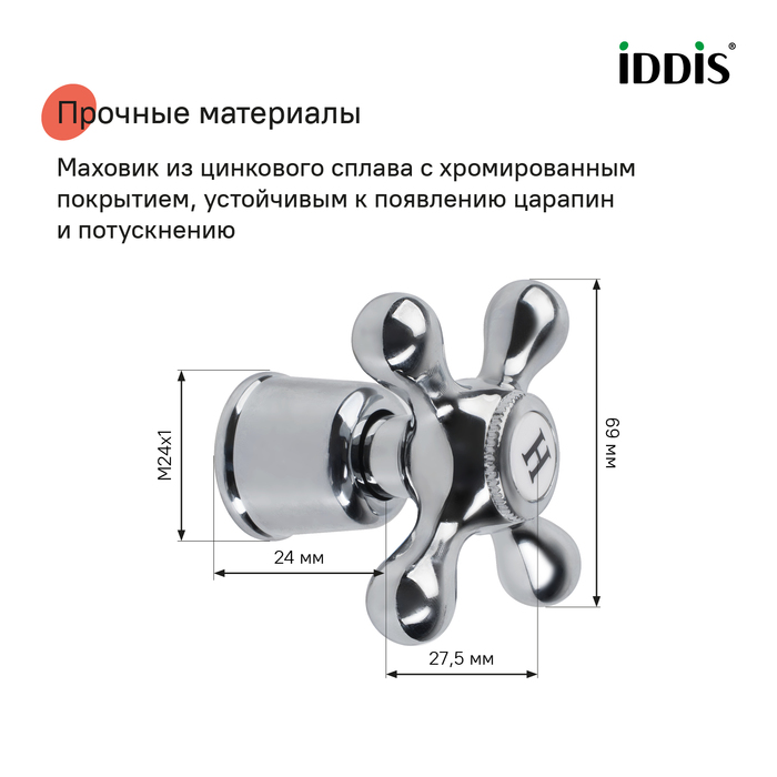 • Маховик изготовлен из прочного цинкового сплава с хромированным покрытием, устойчивым к появлению царапин и потускнению (при должном уходе).