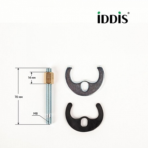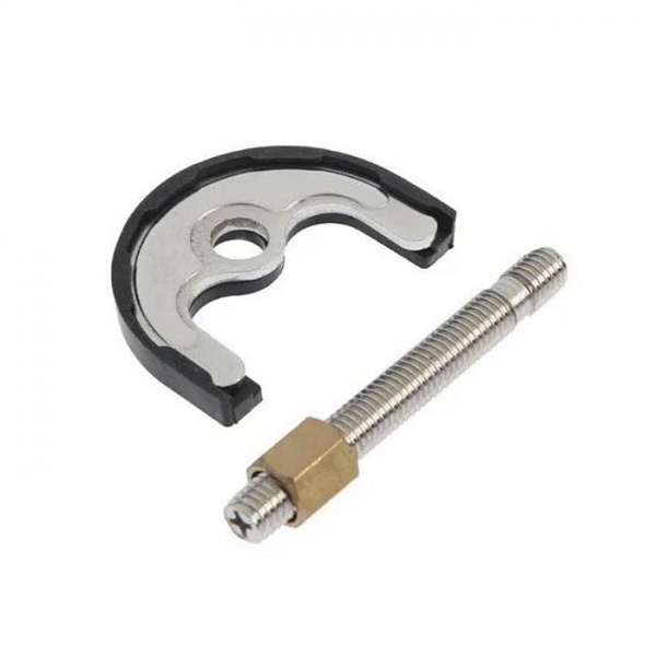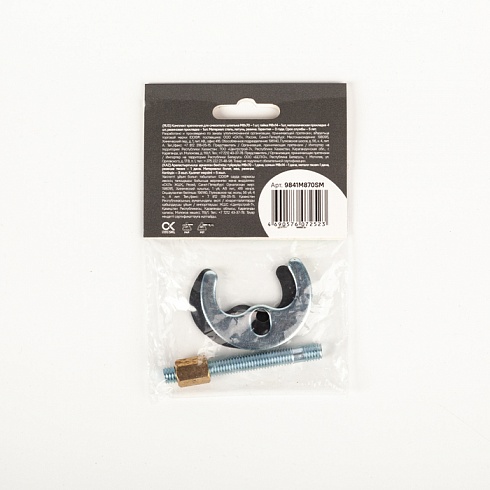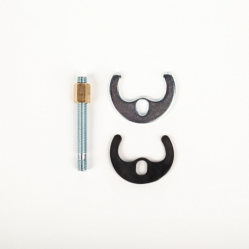В комплекте одна резьбовая шпилька размером М8 и длиной 70 мм, металлическая крепежная пластина, резиновая прокладка и гайка М8.