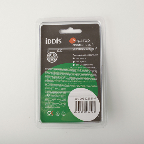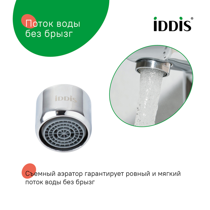 Аэратор представляет собой сетчатую насадку на смеситель, предназначенную для насыщения воды кислородом без заметного снижения напора потока. Работая с минимальным уровнем шума аэратор IDDIS® обеспечивает надёжное функционирование смесителя: он дает возможность улучшить качество воды за счет фильтрации нежелательных примесей. Модель подходит для комплектации кухонных смесителей любых производителей с внешней резьбой крана диаметром 22 мм. Корпусный аэратор имеет декоративный внешний вид и устанавливается с помощью гайки (входит в комплект).