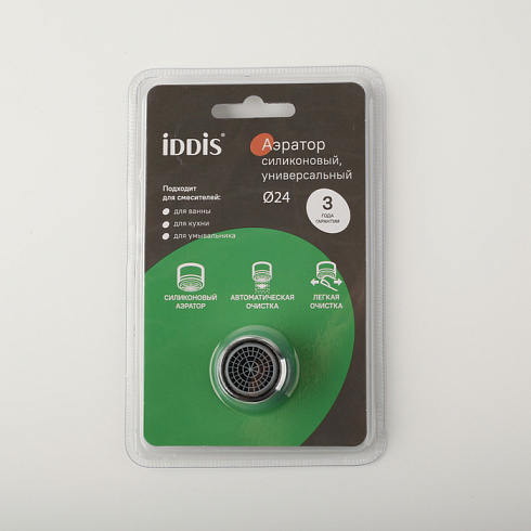 Аэратор представляет собой сетчатую насадку на смеситель, предназначенную для насыщения воды кислородом. Работая с минимальным уровнем шума аэратор IDDIS® обеспечивает надёжное функционирование смесителя: он дает возможность улучшить качество воды за счет фильтрации нежелательных примесей. Модель – универсальна и подходит для комплектации смесителей любого типа и производителей с внутренней резьбой крана диаметром 24 мм. Корпусный аэратор имеет декоративный внешний вид и устанавливается с помощью гайки (входит в комплект).