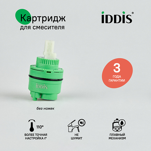 Низкий картридж IDDIS® стандартного диаметра (35 мм) для экономичного управления расходом и температурой воды, подаваемой из смесителя. Позволяет осуществить максимально мягкий и точный контроль благодаря большому углу поворота (110 градусов) и плавной работе движущего механизма изделия. Картридж IDDIS® работает надежно и бесшумно, обеспечивая комфортный поток воды в любой среде, в том числе в условиях ремонта водопроводных сетей. Изделие устойчиво к перепадам температуры и давления, абсолютно безопасно даже при длительном контакте с водой. В верхней части картриджа есть уплотнительное кольцо для создания герметичного соединения со смесителем.