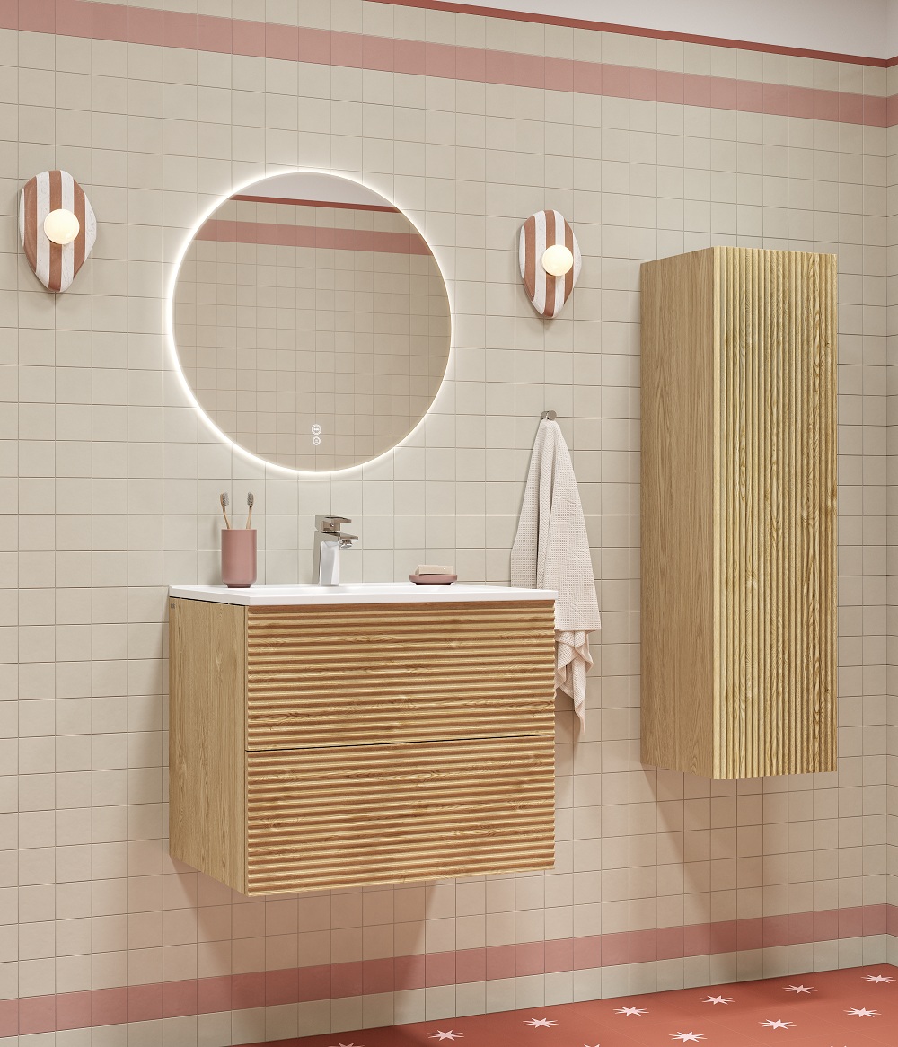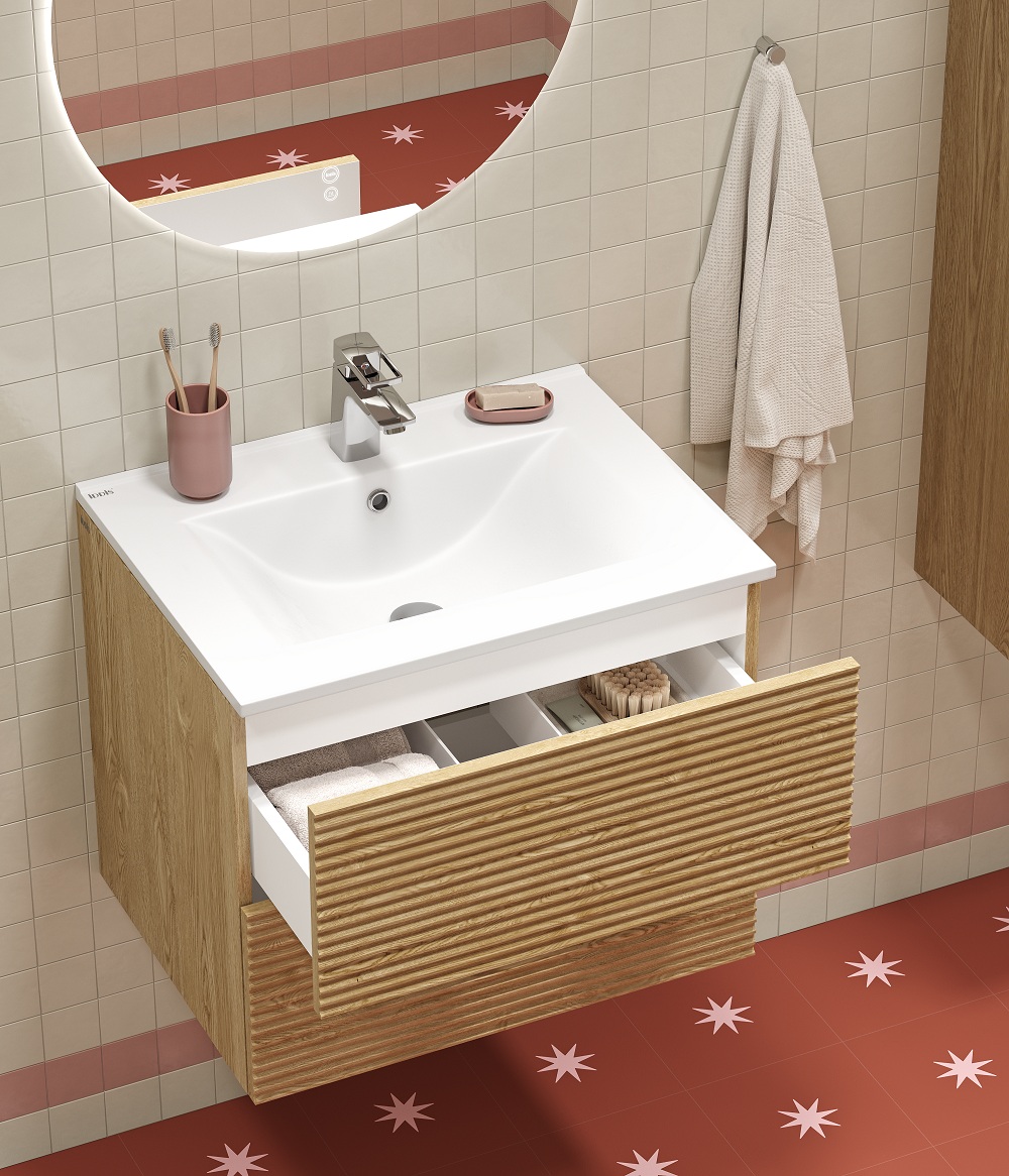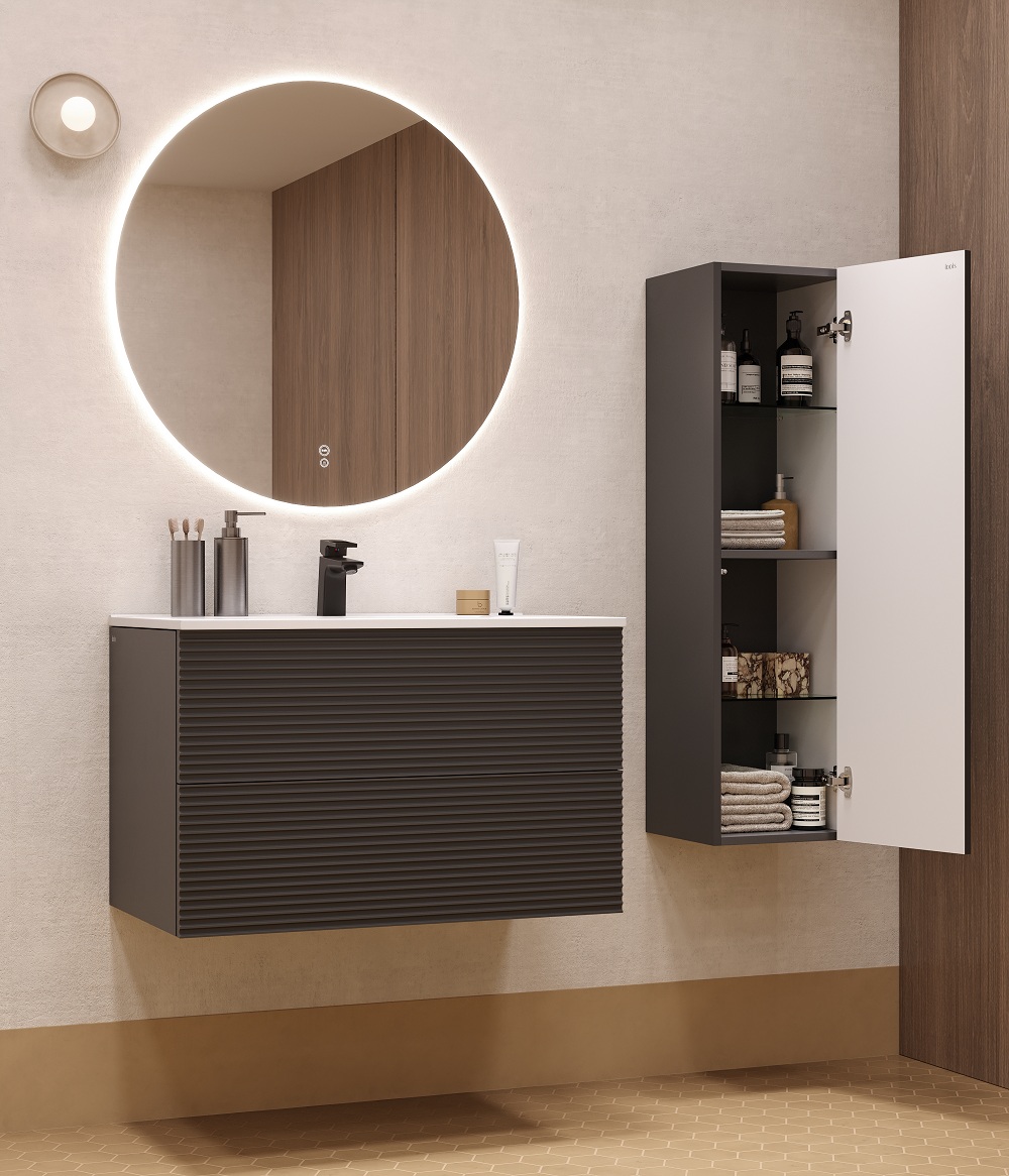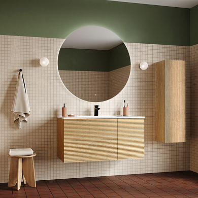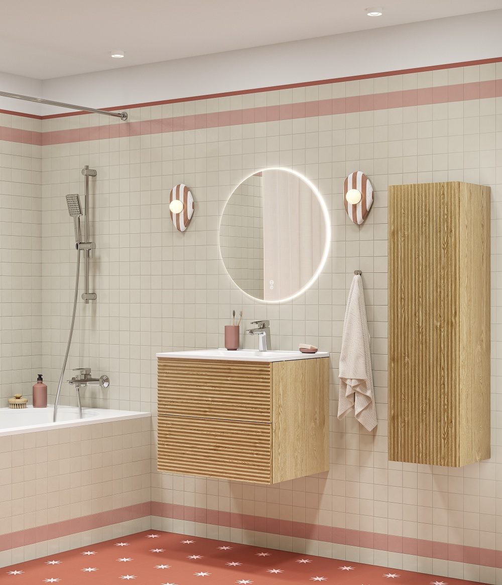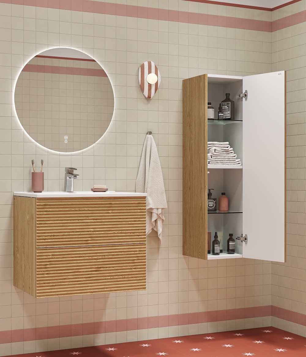 Серия Bild отличается четкими геометрическими формами и прямоугольными гранями, что делает ее желанной и гармоничной для современных интерьеров, и разнообразием наполнения – есть почти всё, чтобы наполнить интерьер ванной. Яркий элемент коллекции – стильная мебель с трендовыми фрезерованными фасадами в оттенке натурального дерева.