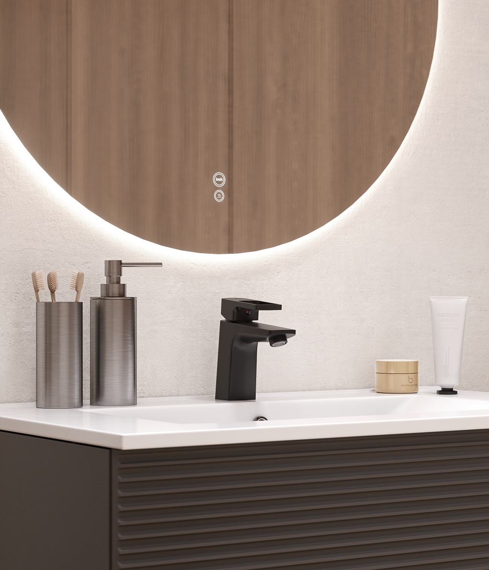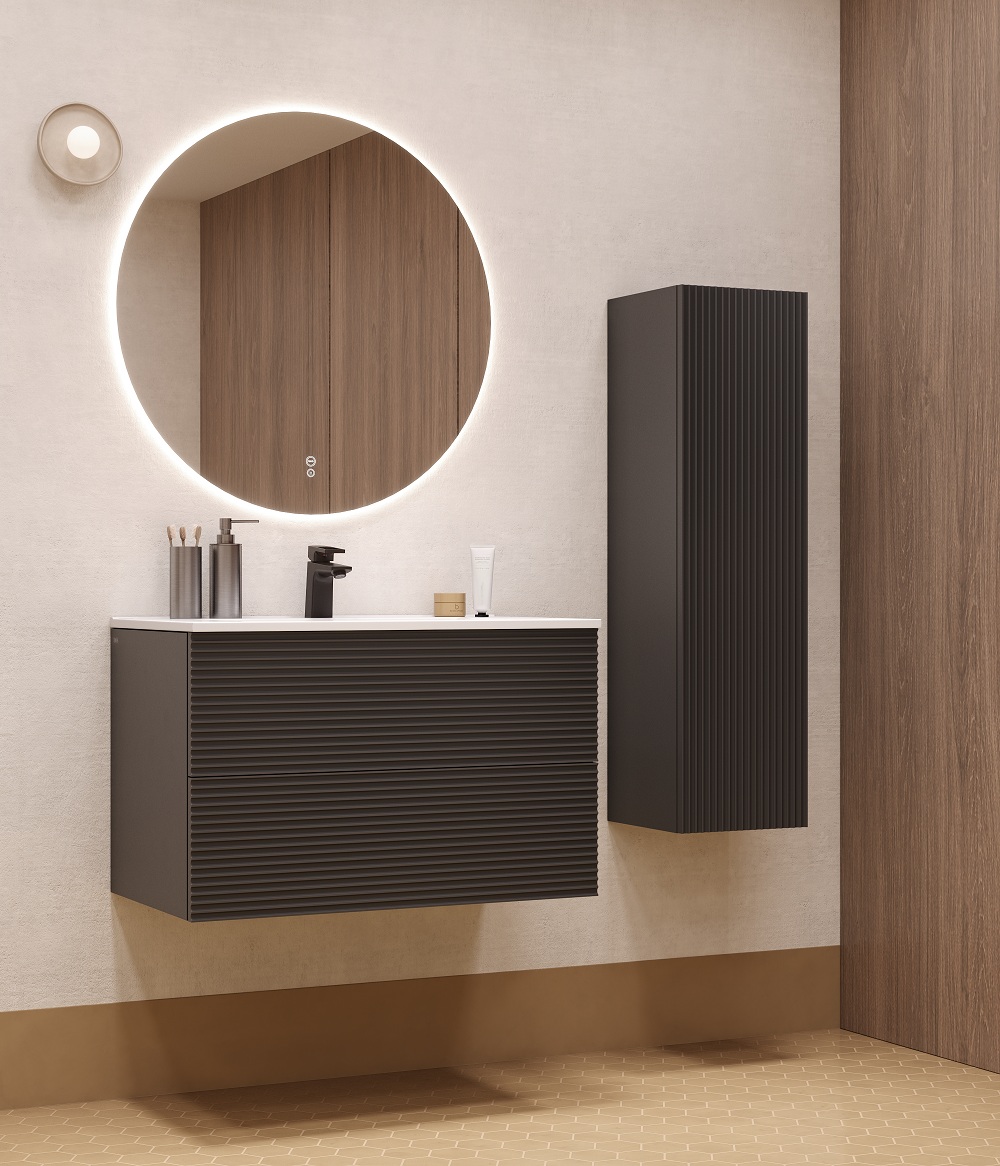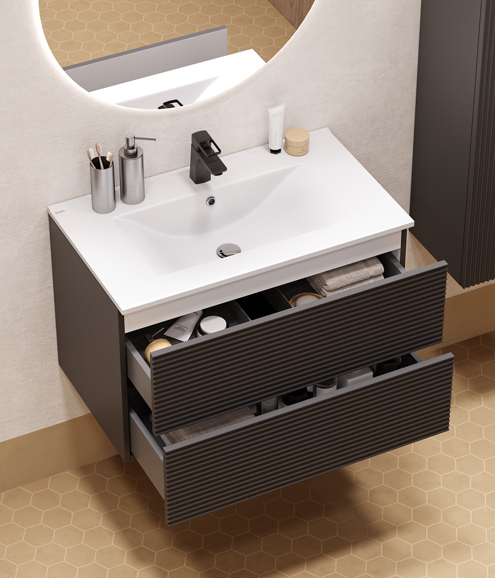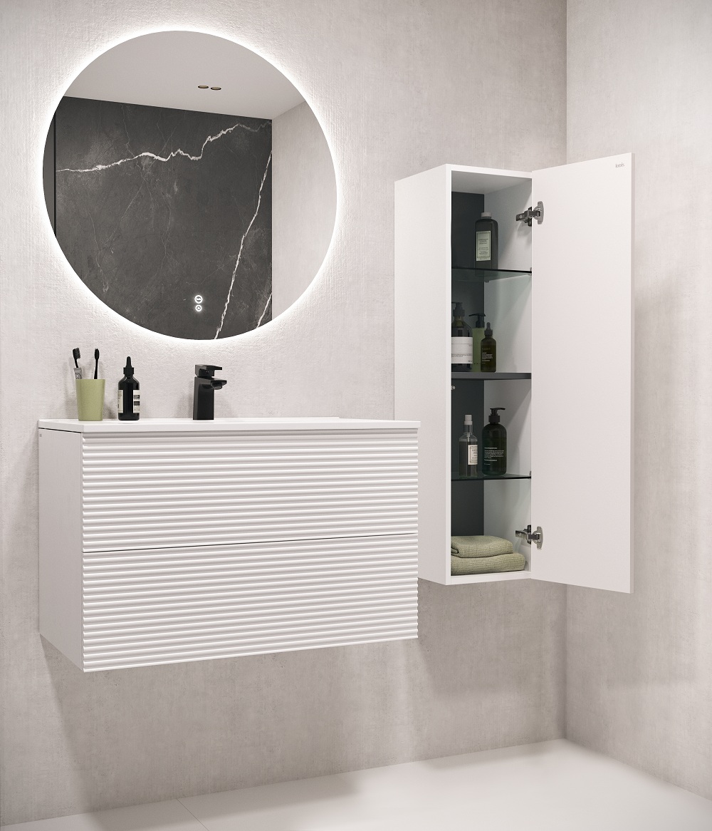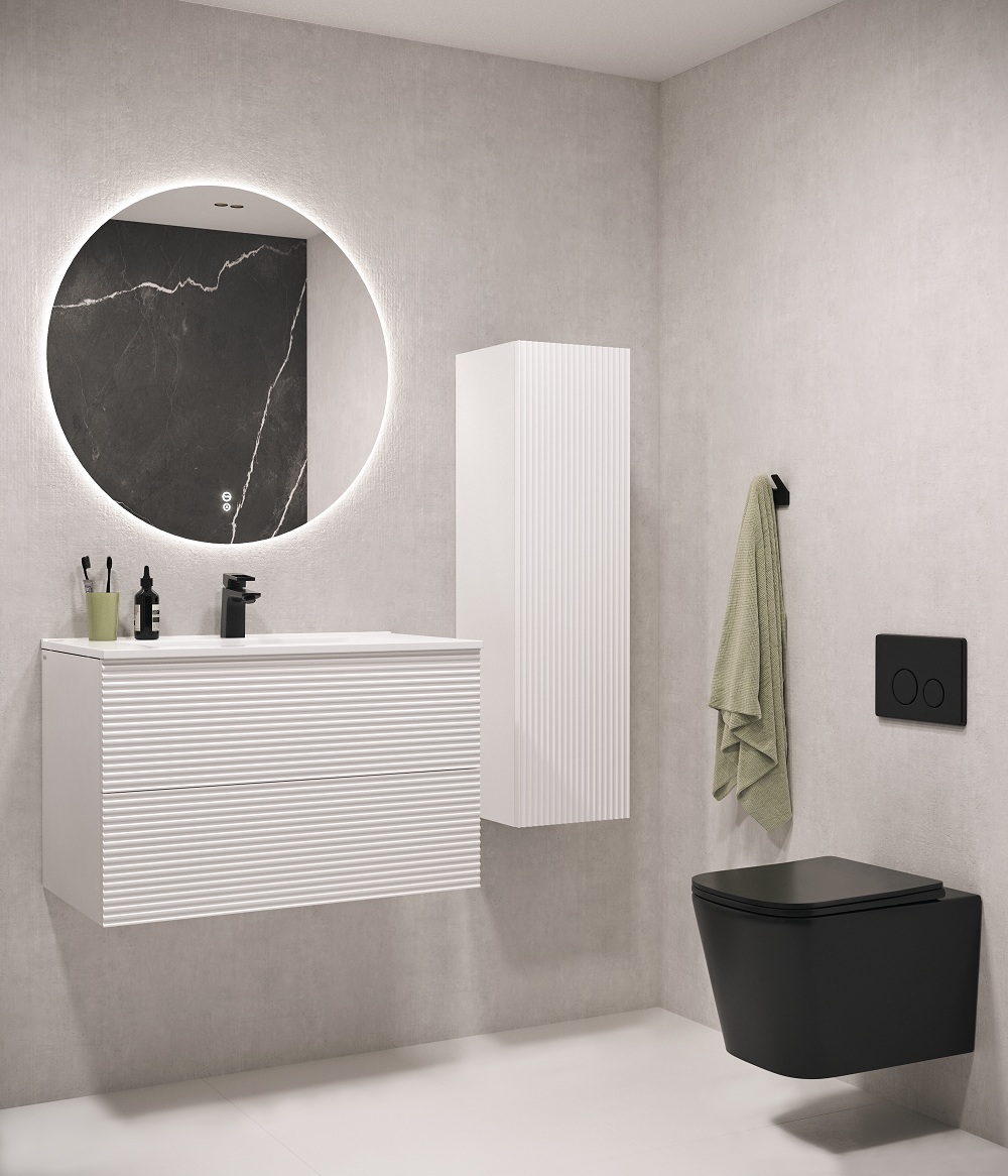 Серия Bild отличается четкими геометрическими формами и прямоугольными гранями, что делает ее желанной и гармоничной для современных интерьеров, и разнообразием наполнения – есть почти всё, чтобы наполнить интерьер ванной. Яркий элемент коллекции – стильная мебель с трендовыми фрезерованными фасадами в оттенке натурального дерева.