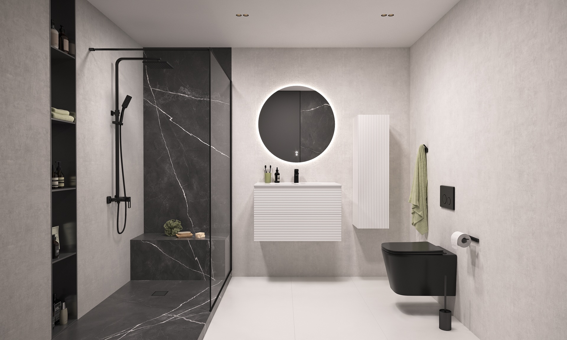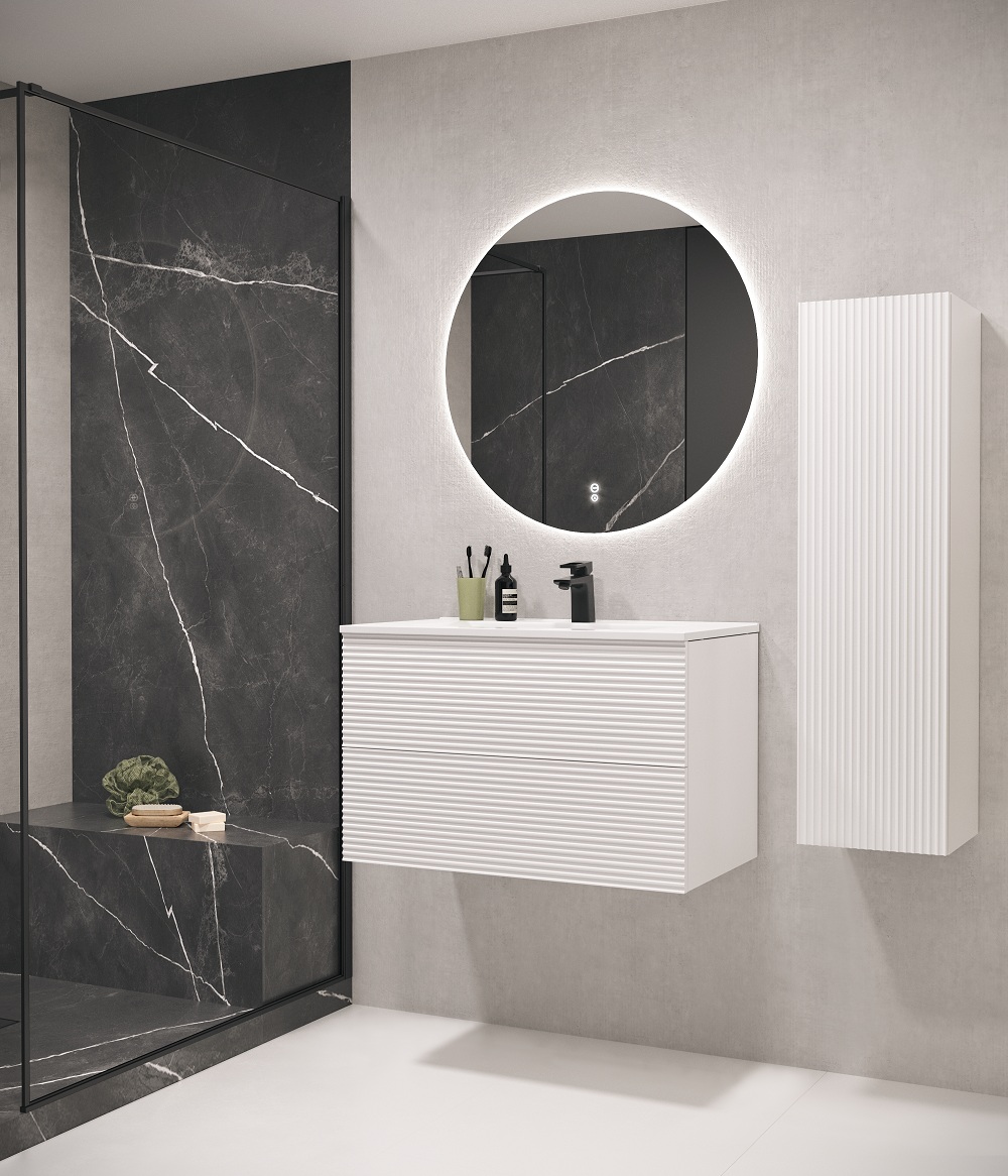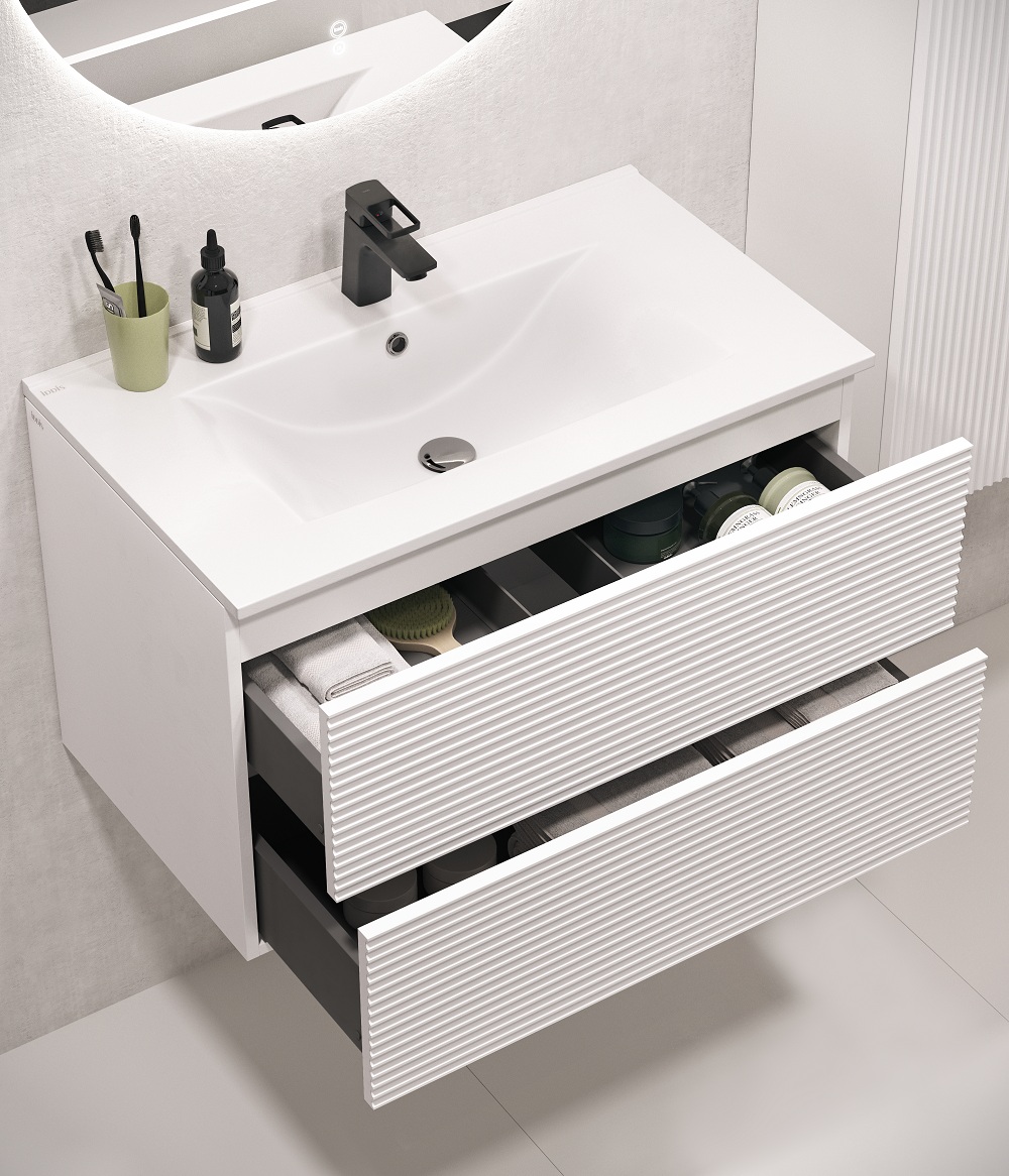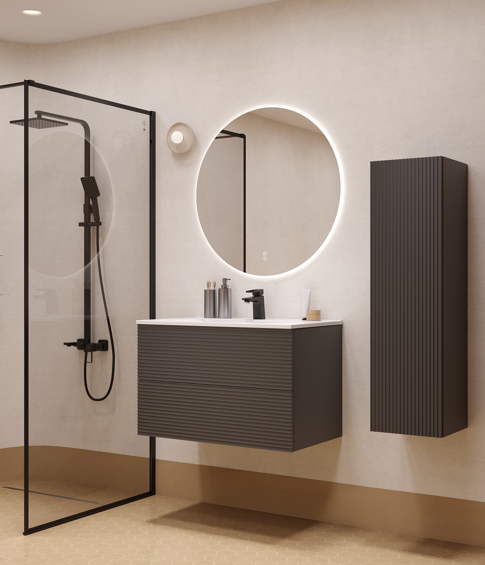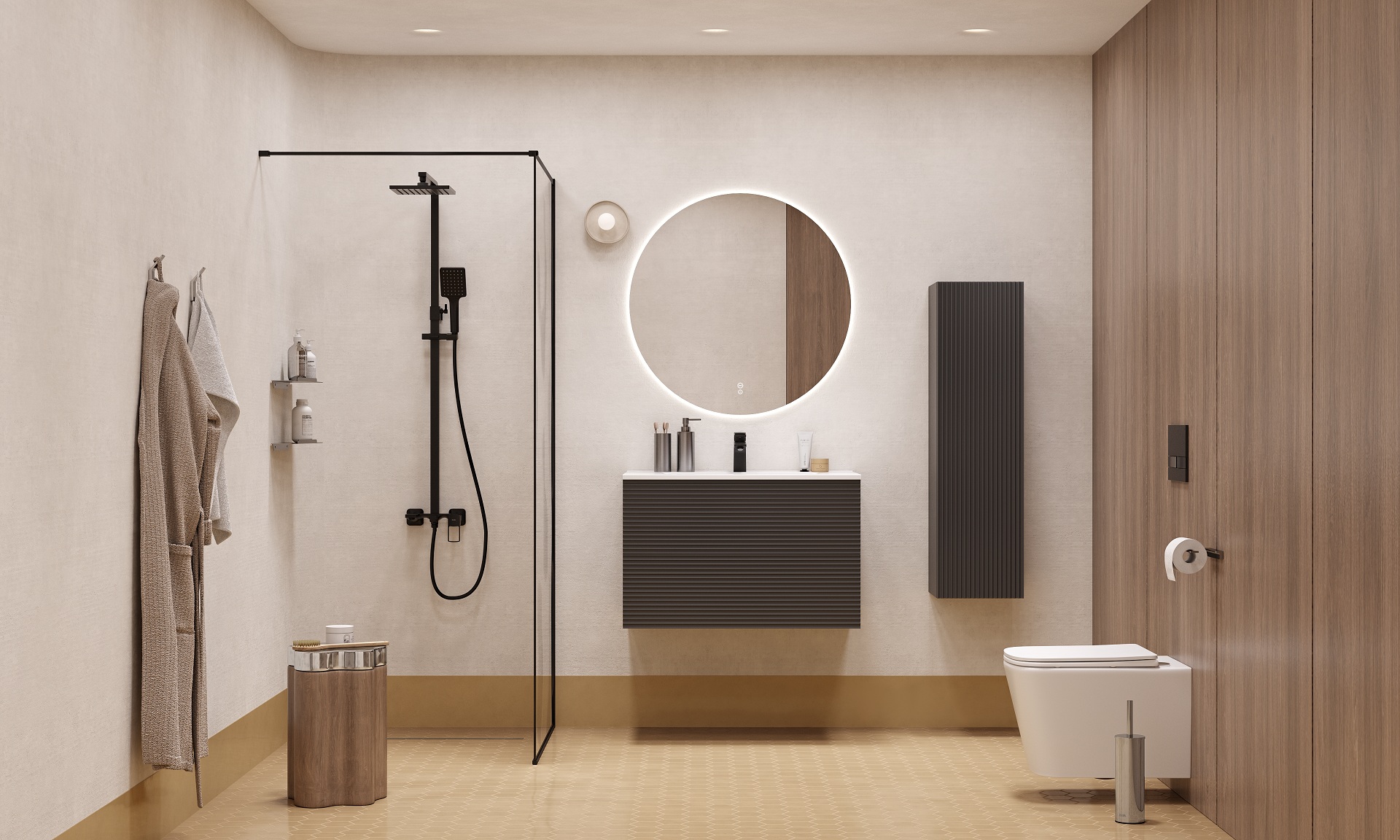 Серия Bild отличается четкими геометрическими формами и прямоугольными гранями, что делает ее желанной и гармоничной для современных интерьеров, и разнообразием наполнения – есть почти всё, чтобы наполнить интерьер ванной. Яркий элемент коллекции – стильная мебель с трендовыми фрезерованными фасадами в оттенке натурального дерева.