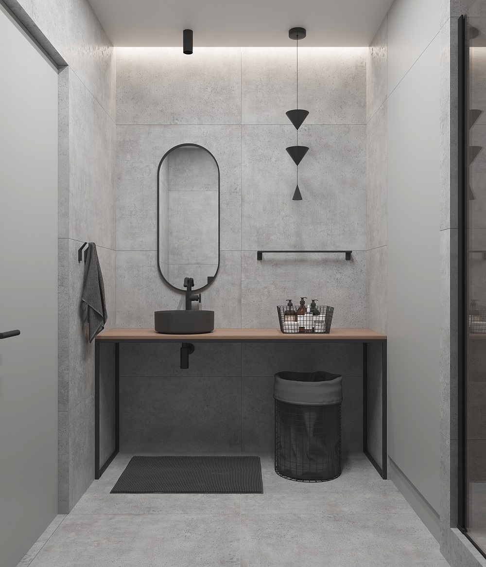 Простота и мужской характер. Сдержанный по геометрии и наполнению совмещенный санузел в квартире холостяка. Выглядит и чувствуется уютным за счет приглушенных цветов и разных фактур: необработанного камня, бетона, дерева, гладкой покраски, которые создают будто многослойное пространство.