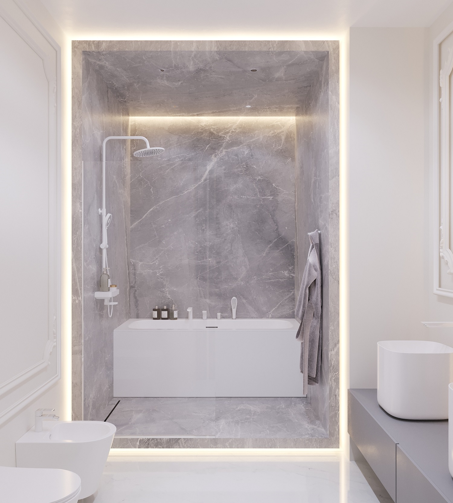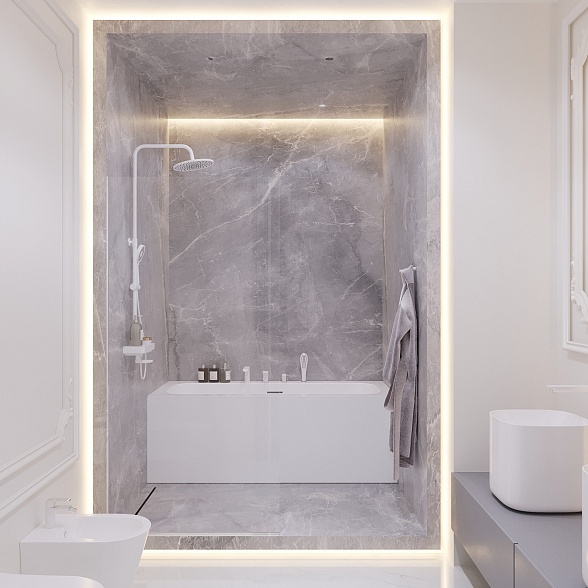 Проект ванной комнате в стиле неоклассики несет в себе идею современной элегантной роскоши и чистоты. Светлая палитра отделки, мебели и сантехники дает ощущение невесомости, легкости и изящества. Встроенная подсветка добавляет тело и уют.